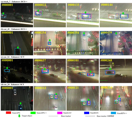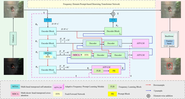 针对在低光条件下无人机跟踪性能受限于机载摄像头硬件,以及复杂环境下普遍存在的噪声与模糊问题,该研究提出基于频域提示的降噪Transformer网络(FPDT)。具体而言,设计了一个轻量级自适应频率提示学习模块(AFP-LM),其中FLB通过频域分析实现高频与低频特征的自适应分离与交互;PB则动态生成频率提示,引导模型抑制高频噪声,从而提升跟踪器的特征提取能力。为进一步强化跨域特征表示,引入双向交叉融合模块(BCFM),实现频域与空间域信息的双向交互。此外,解码器中集成的多卷积头转置交叉注意力机制(MDCA)可促进多尺度特征交叉融合。结果表明,FPDT在多个无人机夜间跟踪基准测试中均取得优异性能,为真实场景下无人机夜间跟踪的应用开发提供了有力的技术支撑。