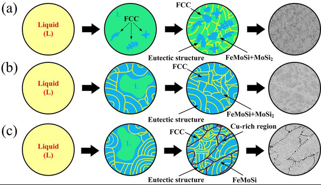 图1 FeCoCrNiMoCuxSi0.2高熵合金微观组织演变示意图:(a)x=0.4;(b)x=0.6;(c)x=0.8