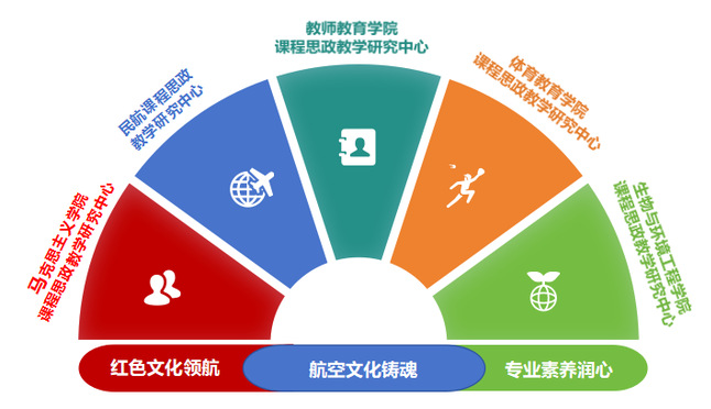一中心一特色。立足航空办学特色和多学科优势特色,为深化课程思政建设、构建特色化育人体系,我校课程思政教学研究中心重点遴选马克思主义学院课程思政教学研究中心、民航课程思政教学研究中心、教师教育学院课程思政教学研究中心、体育教育学院课程思政教学研究中心、生物与环境工程学院课程思政教学研究中心5个校级课程思政教学研究示范中心,以“一中心一特色”激活课程思政新动能(图1)。其中,马克思主义学院课程思政教学研究中心锚定“红色引领”核心,深挖红色资源、传承红色基因,打造思政教育的“红色主阵地”;民航课程思政教学研究中心紧扣行业特质,以“蓝色情怀”为纽带,将航空报国精神、民航职业素养融入教学,筑牢“蓝天铸魂”的育人根基;其余中心立足各自专业领域,绽放“专业色彩”。教师教育学院彰显“育人本色”,培育未来教师的师德师风;体育教育学院点亮“活力亮色”,传递拼搏向上的体育精神;生物与环境工程学院厚植“生态底色”,强化绿色发展的责任担当。五大中心协同发力、各展所长,共同构建起“红、蓝、彩”交相辉映的课程思政特色品牌矩阵,为立德树人根本任务落地见效提供坚实支撑。