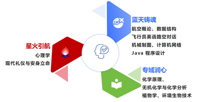 一课程一亮点。我校以“一课程一亮点”为核心,打造“蓝天铸魂”“星火引航”“专域润心”三类省级课程思政示范课程集群,累计获批12门省级课程思政示范课程,形成“类群有特色、课课有亮点”的育人格局(图3)。“星火引航”锚定价值引领,《心理学》以“师德育人”、《现代礼仪与安身立德》以“云端育德”为亮点,将教育情怀、民航服务宗旨与礼仪素养培育相结合,厚植师生职业信仰与人文精神;“蓝天铸魂”聚焦航空与信息领域,《航空概论》凸显“航空强国”、《飞行员英语陆空通话》坚守“航空安全责任”、《机械制图》展示“航空智造”、信息类课程传递“工匠精神”“算法守正”“科技报国”等理念,将航空报国精神、行业职业素养与信息技术伦理深度融入课程设计。“专域润心”覆盖化工、生物等学科,《化学原理》《无机化学与化学分析》《植物学》《环境生物技术》等课程,从“严谨求真”的实验规范到“生命敬畏”的生态理念,从“工程守正”的伦理责任到“生态报国”的环保担当,挖掘学科独特思政元素,实现专业知识与价值引领的精准融合。三类课程各展所长、协同育人,通过“一课程一亮点”的精准打造,让每门省级示范课程都成为思政育人的“闪光点”,为全校乃至全省同类课程思政建设提供了可复制、可推广的范例。
