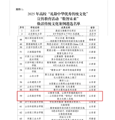 近日,教育部思想政治工作司公布《关于2025年高校“礼敬中华优秀传统文化”宣传教育活动结果的公示》,我校报送的由图书馆刘翠翠老师指导的项目《以数智为翼,让黄河香魂跨越时空——山东航空学院“香创”项目创新传统文化育人实践》入选“数智未来”焕活传统文化案例优秀作品。该作品以传统文化数字化传承与社会公益服务的双维突破,彰显了学校在文化育人领域的扎实实践与创新成效。