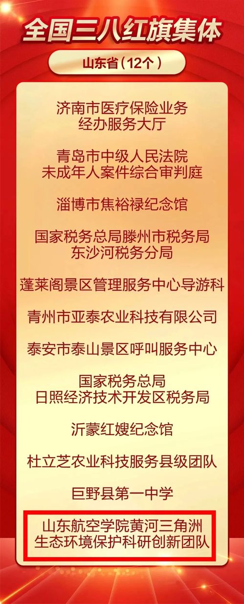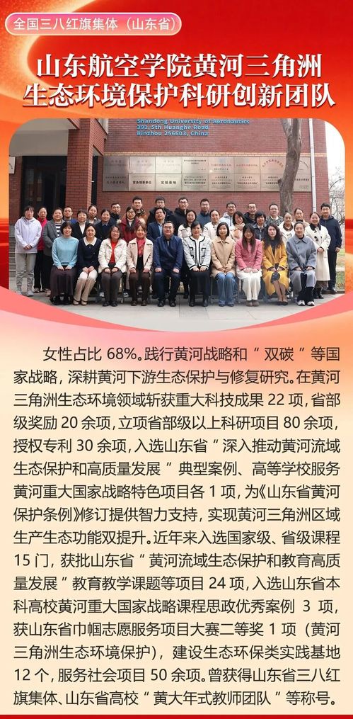 近日,全国妇联2025年度全国三八红旗手标兵、全国三八红旗手、全国三八红旗集体、全国巾帼文明岗全名单公布。山东航空学院黄河三角洲生态环境保护科研创新团队被授予“全国三八红旗集体”荣誉称号,为我校再添一项国家级殊荣。