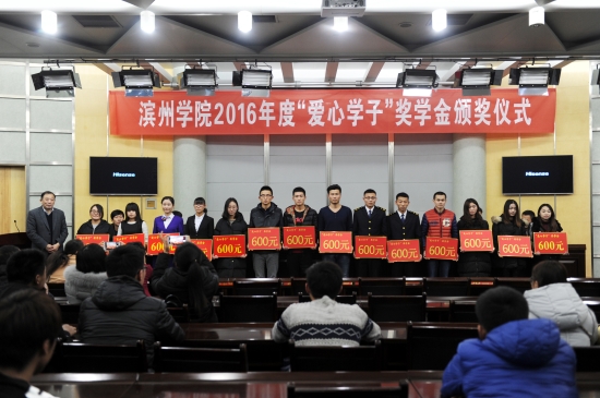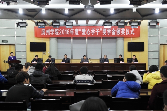 12月13日,校团委和滨州市中心血站联合举办的2016年度“爱心学子”奖学金颁奖仪式在学苑会堂第三报告厅举行。我校党委委员、副校长李伟年,滨州市卫计委副主任、市中心血站站长孙景华出席仪式。团委、学生工作处负责人,滨州市中心血站相关工作人员,我校各院(系)团总支书记、学生代表近130人参加了仪式。