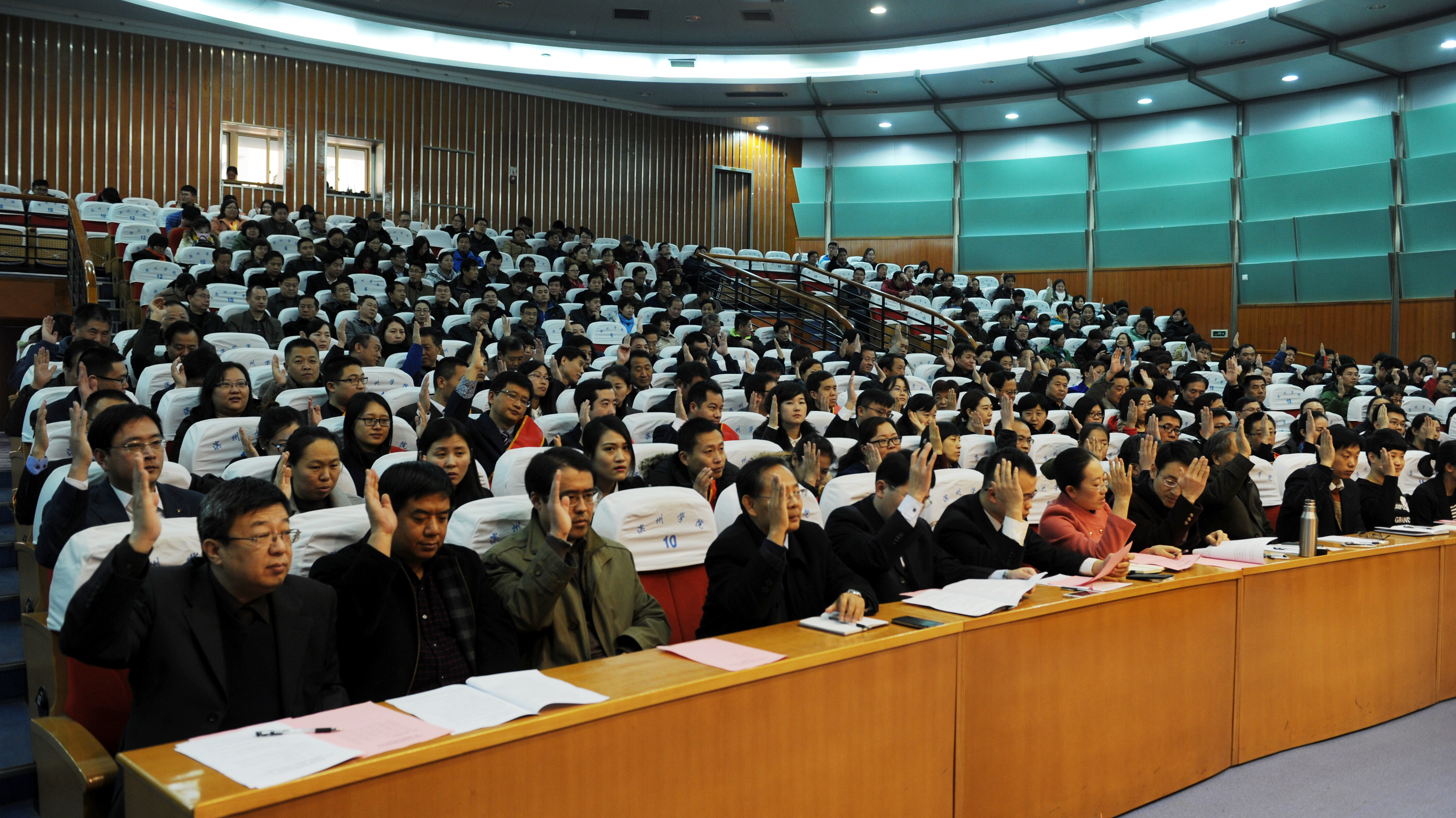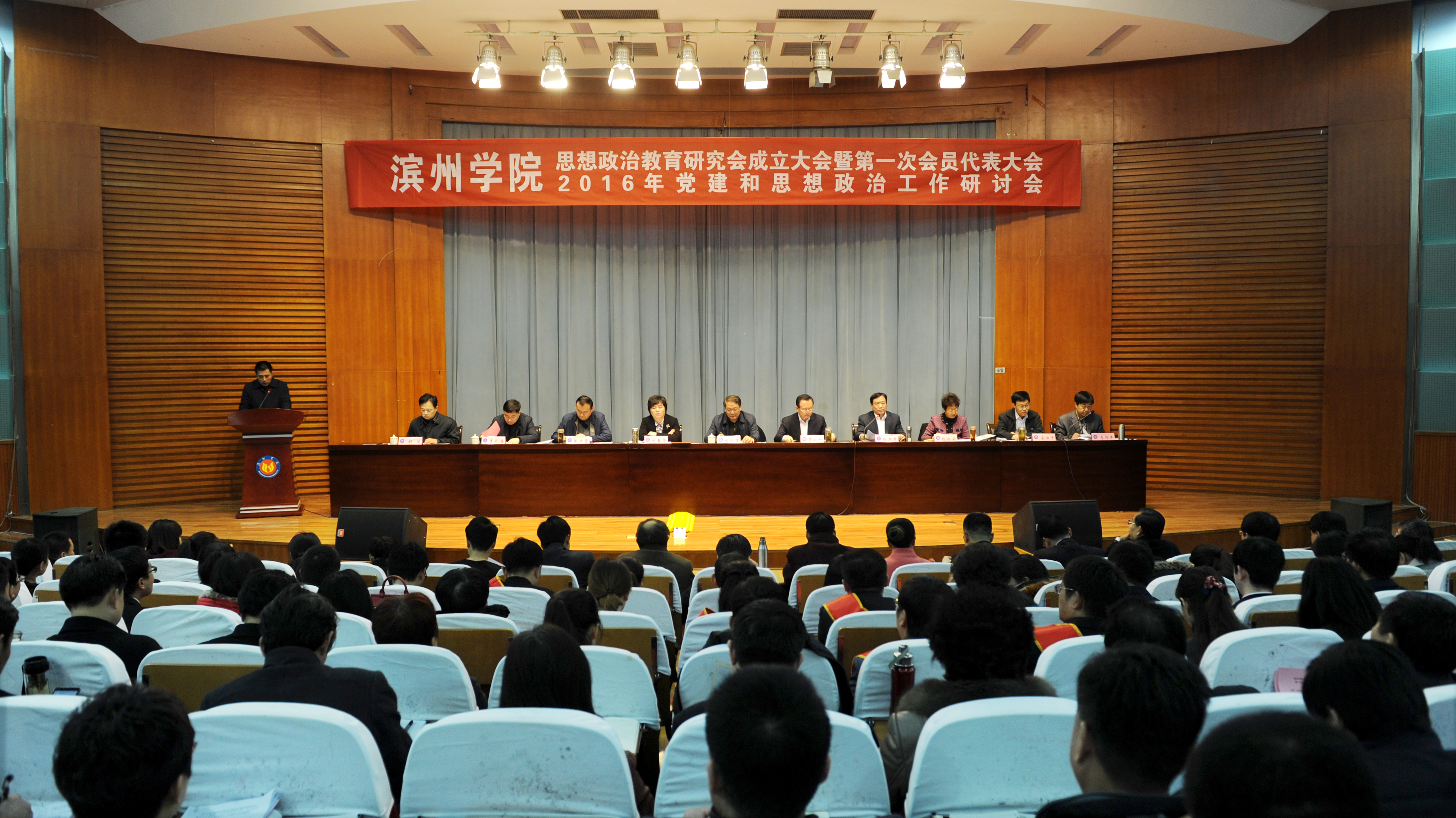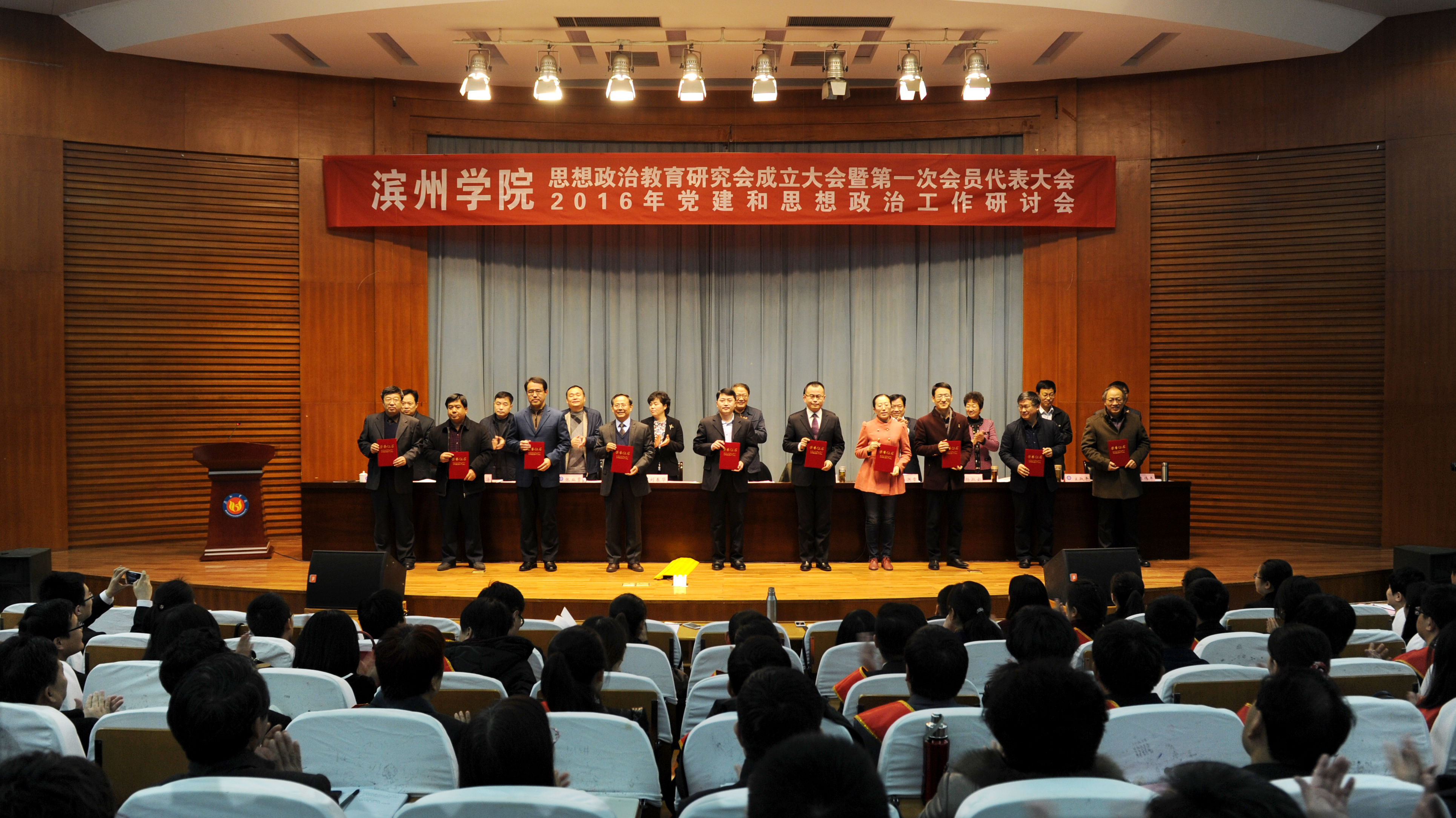 12月23日,我校思想政治教育研究会成立大会暨第一次会员代表大会、2016年党建和思想政治工作研讨会在学苑会堂第二报告厅隆重举行。山东省委高校工委副巡视员刘欣堂,我校党委书记罗公利,党委副书记、校长刘春华,党委副书记杨洪章,党委委员、副校长张业赏,党委委员、纪委书记杨淑云,党委委员、副校长李长海、宋淑平、胡波、李伟年出席会议。杨洪章主持会议。