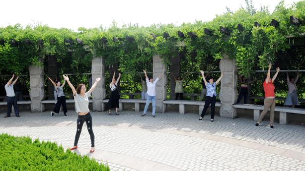 “第九套广播体操现在开始,原地踏步走,一二三四……”6月8日上午9时45分,伴随着熟悉的广播体操旋律,我校党委副书记、校长刘春华来到聚英湖畔紫藤亭广场,和50余名坐班干部、教职工一起做工间操。