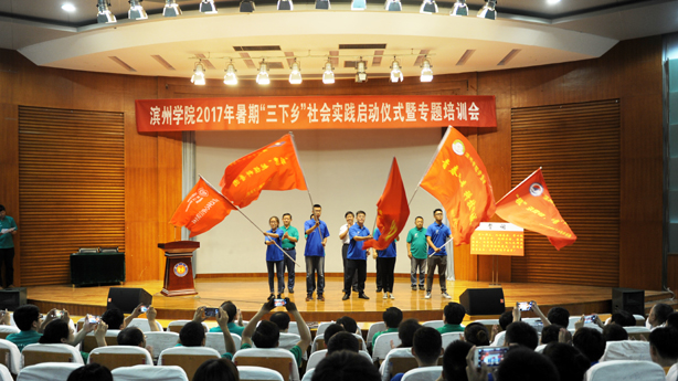 仪式上,李伟年为我校2017年暑期“三下乡”社会实践服务团授总旗。党委宣传部、教务处、学生工作部、团委负责人为团队代表授队旗;团委负责人宣读了《关于做好2017年大学生志愿者暑期文化科技卫生“三下乡”社会实践活动的通知》;指导教师代表和学生代表分别作了发言。