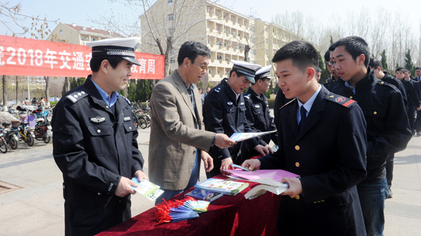 同日,我校春季“交通安全宣传教育周”活动正式启动,滨州市公安局党委委员、交警支队支队长王洪涛,市公安局交警支队副支队长顾晓光,经济技术开发区交警大队大队长张长玉等出席了启动仪式,并现场向同学们发放了交通安全宣传材料。学生工作部、保卫处、团委相关人员和1000余名师生参加了仪式。