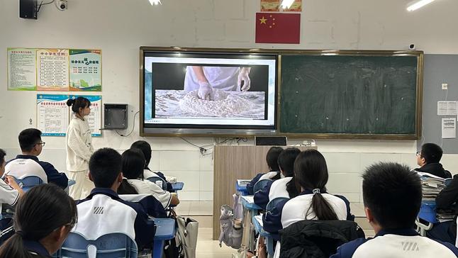 为深入学习贯彻习近平总书记关于“大思政课”建设的重要指示精神,10月15日,我校马克思主义学院正式启动“非遗文化进校园”系列实践项目。首场活动以“滨州锅子饼:指尖上的非遗传承”为主题,组织青年学子走进渤海中学初三(3)班,通过“青年讲师团”授课、非遗技艺体验、文化价值研讨等形式,创新打造“行走的思政课堂”。