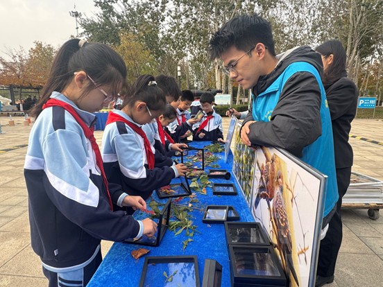 齐聚黄河一畔,以“万里同心之志”,共赴“守护黄河之约”。志愿者积极发挥专业优势,带来了一场别开生面的生态科普课堂;通过展示学院教师参编的滨州本地珍稀鸟类图集和高清珍稀鸟类影像,系统讲解国家保护动物名录中诸多鸟类的形态特征、生活习性及其在生态系统中不可或缺的作用,激发现场民众对黄河生态流域的浓厚兴趣与守护热情。“今天在志愿者哥哥姐姐们的引导下,认识了好多以前没见过、甚至没听过的鸟儿!原来它们都是黄河的“小卫士”。我要像它们一样,做保护黄河的小卫士,让“母亲河”永远美丽动人。”中海中学四年级学生李某如是说到。实践环节中,志愿者一对一指导现场民众操作高倍望远镜,学习科学观鸟方法,引导他们在亲身体验中感受生物多样性的魅力,激发保护生物多样性的主体动能。活动现场配套设置了动植物标本制作工坊与“环保知识知多少”有奖问答,鼓励民众在动手实践与趣味互动中深化对黄河流域生态保护的内涵式理解,将“万里同心,共护黄河”的绿色理念内化于心、外化于行。