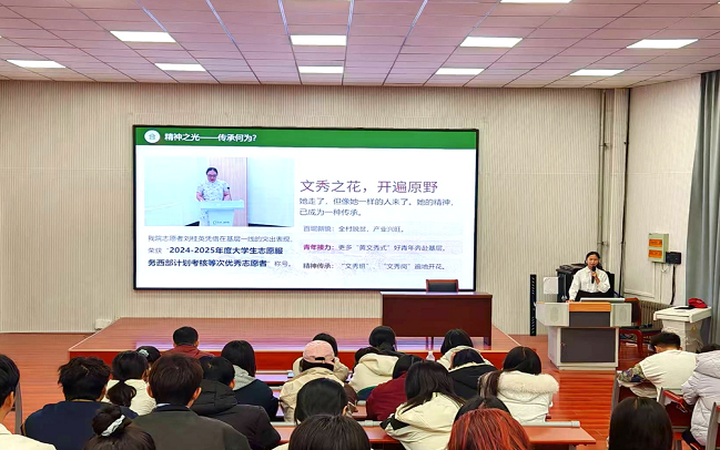 随后,高小冉将目光聚焦身边榜样,分享了经济管理学院2024年西部计划志愿者刘桂英同学的基层实践故事。在基层岗位上,刘桂英始终坚守初心、脚踏实地,秉持“奉献、友爱、互助、进步”的志愿精神,积极投身基层单位党建品牌打造、社区工作清单编制、基层治理专项整治等重点工作,以青春之力扛起青年担当,凭借优异表现荣获“2024-2025年度大学生志愿服务西部计划考核等次优秀志愿者”称号。一个个真实可感的实践场景,让同学们深切体会到,扎根基层从不是空洞的口号,而是可触可及、切实可行的青春选择。