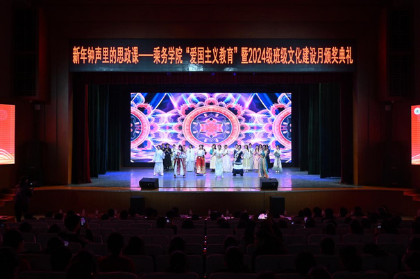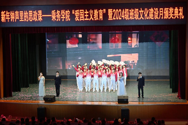 成果汇演聚合力,促升华。以“新年钟声里的思政课——爱国主义教育暨班级文化建设月颁奖典礼”为载体,将活动成果与思政教育深度融合。颁奖典礼上,12个班级的节目全部源自文化建设月原创成果,通过情景剧、合唱、朗诵、舞蹈等艺术形式,围绕“爱国、使命、团结、守纪、青春、逐梦”等主题深情演绎。其中,24航管本8班的《回家》以深情的演绎传递对祖国统一的殷切期盼,引发全场共鸣;其他班级则紧扣“航空报国”初心,诠释了乘务学子的责任担当与精神追求,让爱国主义教育在沉浸式体验中入脑入心。