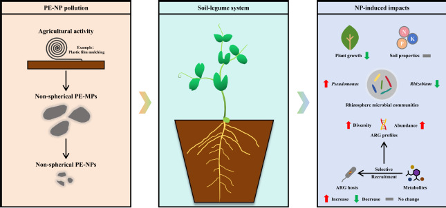 随着人类对塑料制品依赖程度的不断加深,土壤生态系统中纳米塑料污染问题日益凸显。作为新兴环境污染物,纳米塑料的生态风险准确评估已成为当前环境科学领域的重要前沿课题和研究难点。现有研究多集中于理想化形态的球形纳米塑料,而实际环境中的纳米塑料普遍呈现不规则的非球形特征。刘丙申博士团队聚焦于更贴近真实污染情境的非球形聚乙烯纳米塑料,以豌豆根际微生态系统为研究对象,系统揭示了其特有的生态效应及作用机制。